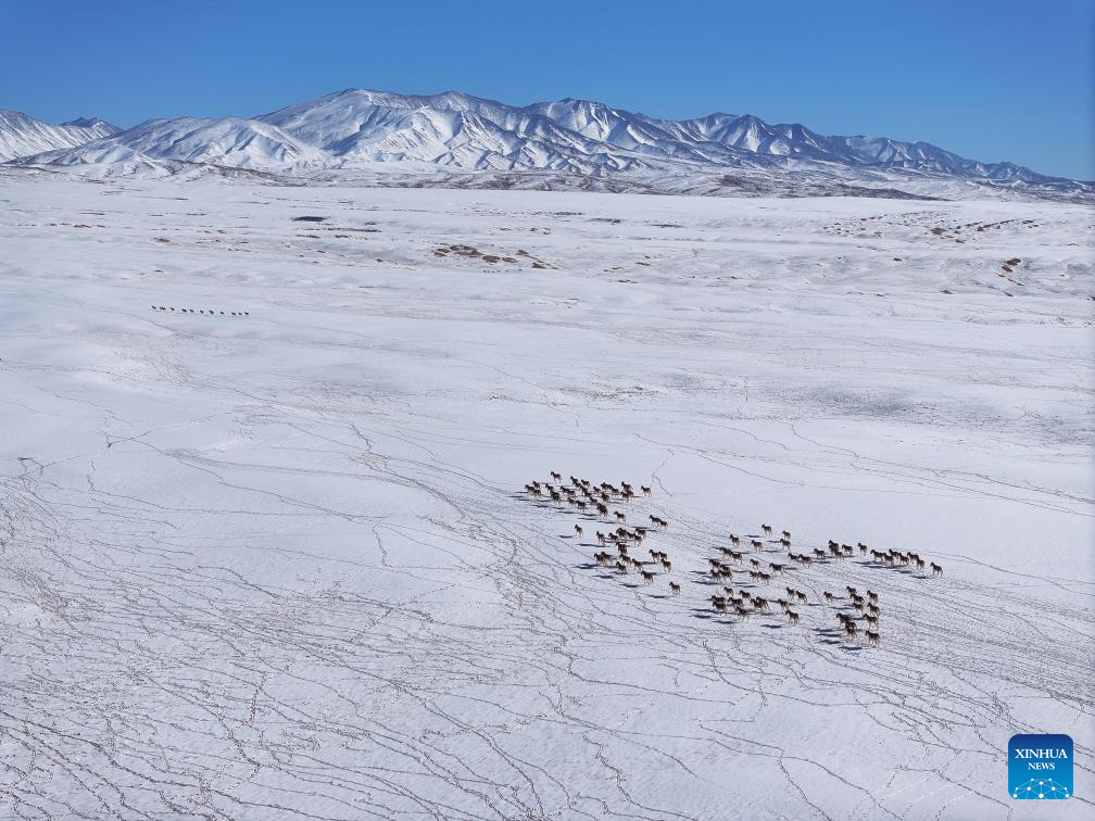 This aerial drone photo take on Jan. 9, 2026 shows Tibetan wild donkeys in Haltent in the Kazak Autonomous County of Aksay, northwest China's Gansu Province. (Photo by Gao Hongshan/Xinhua)