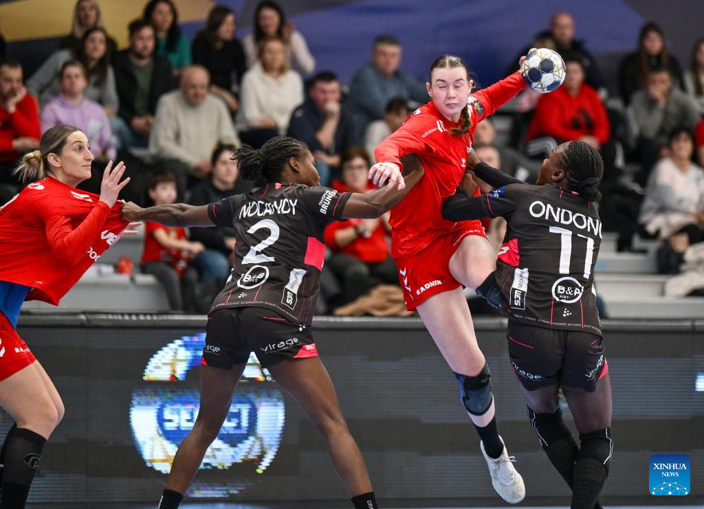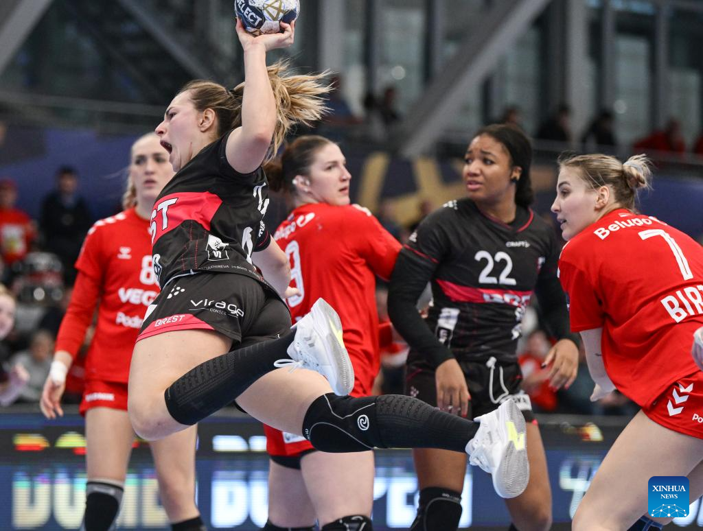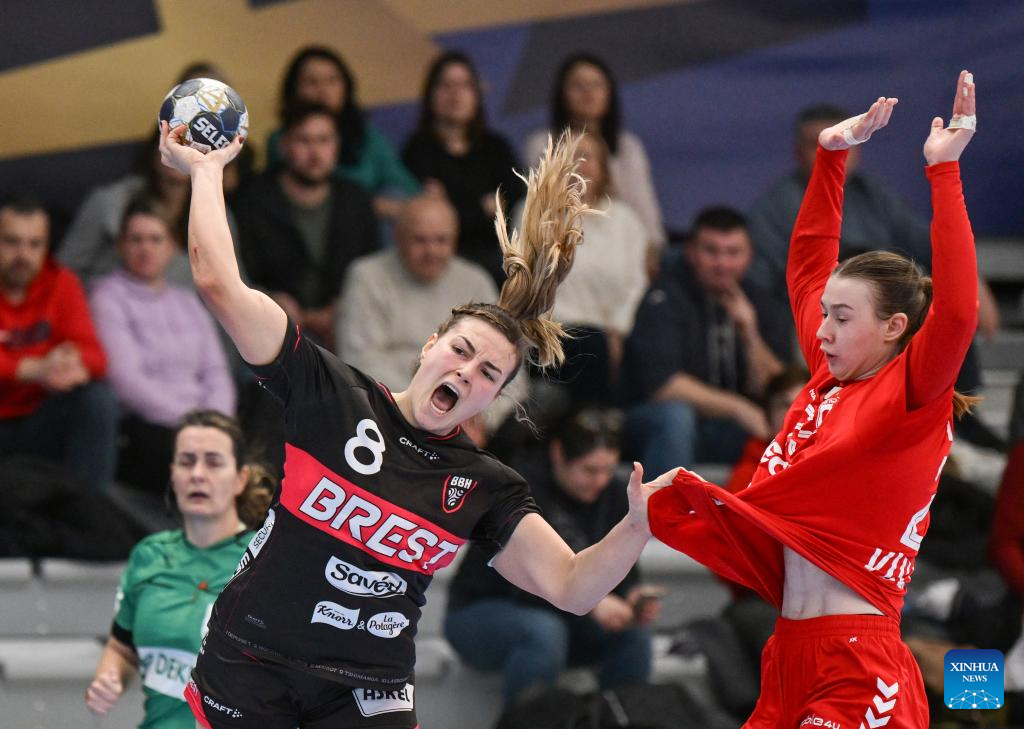 Clarisse Mairot (L) of Brest Bretagne Handball shoots the ball during the EHF Champions League Women Group Phase match between HC Podravka and Brest Bretagne Handball in Koprivnica, Croatia, on Jan. 11, 2026. (Photo by Igor Soban/PIXSELL via Xinhua)