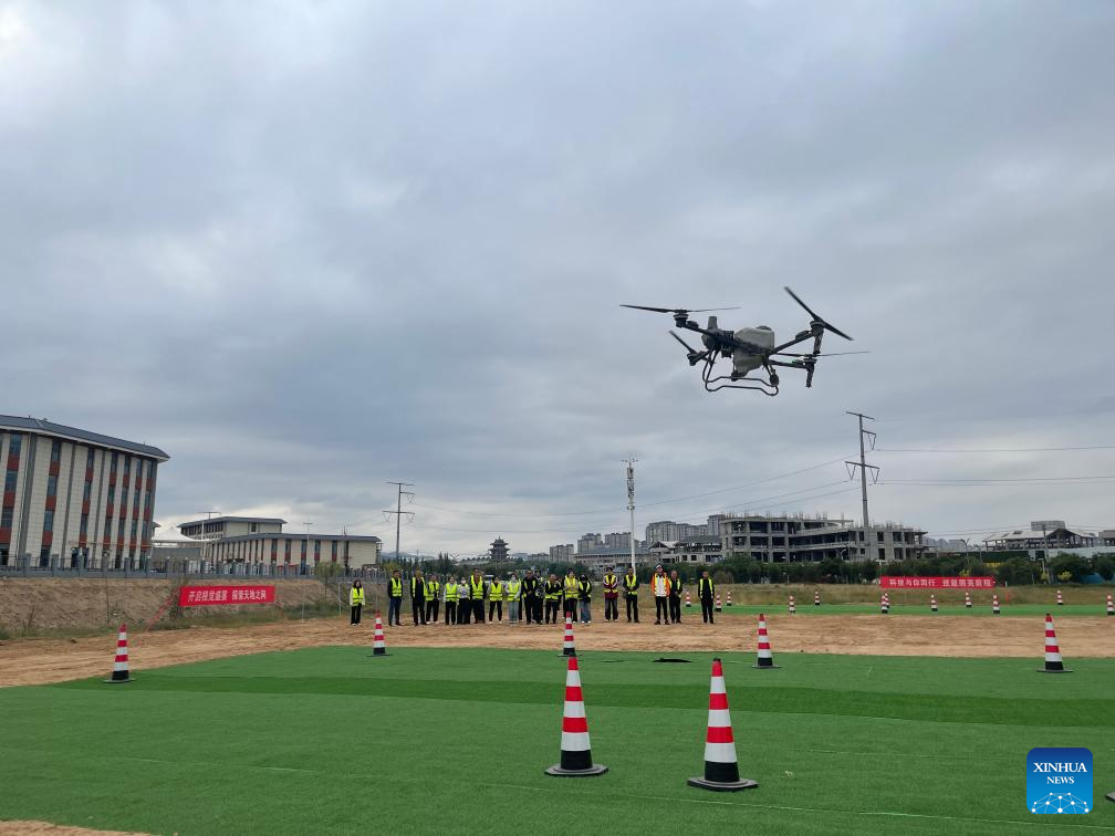 This photo taken on Sept. 17, 2025 shows a scene of a drone training lesson organized by the local government in Baiyin, northwest China's Gansu Province. (Xinhua/Cheng Nan)