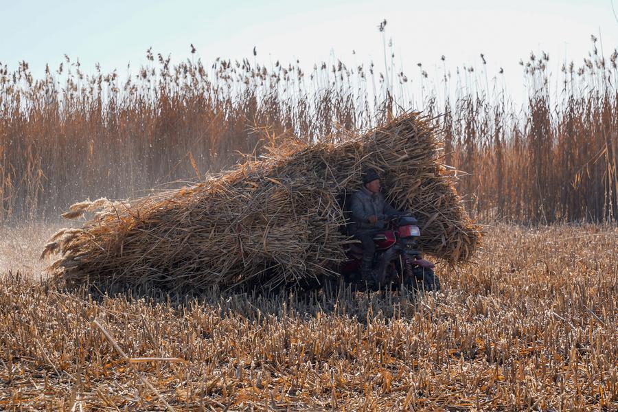 Braving an air temperature below the freezing point, local farmers are now busy preparing reeds and laying sand grids. Apart from consolidating the ecological security line for the neighborhood, their contribution also brings in extra income for their own families.