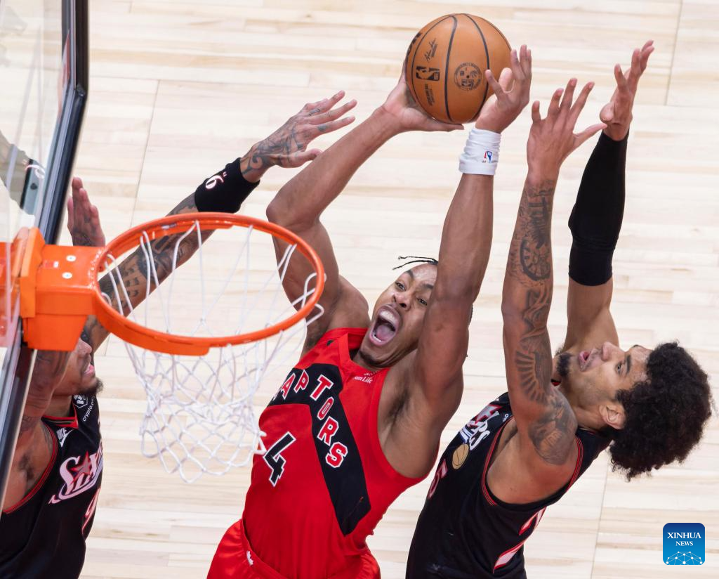 Alijah Martin (C) of Toronto Raptors goes for a layup during the 2025-2026 NBA regular season game between Toronto Raptors and Philadelphia 76ers in Toronto, Canada, on Jan. 11, 2026. (Photo by Zou Zheng/Xinhua)