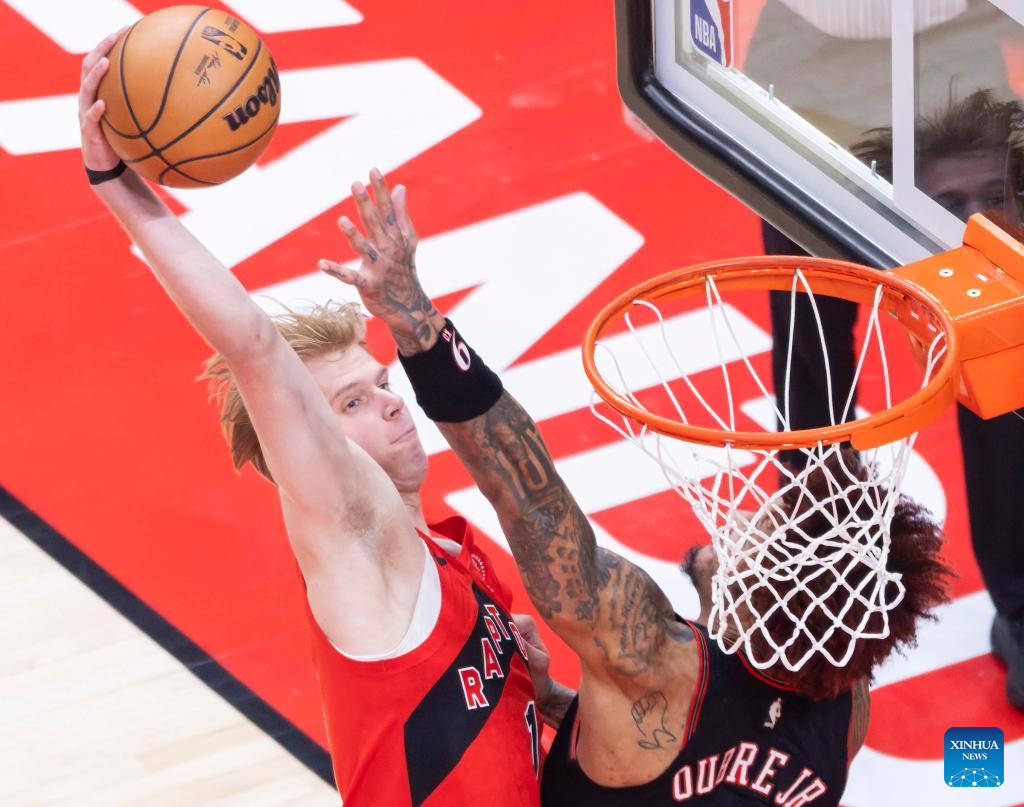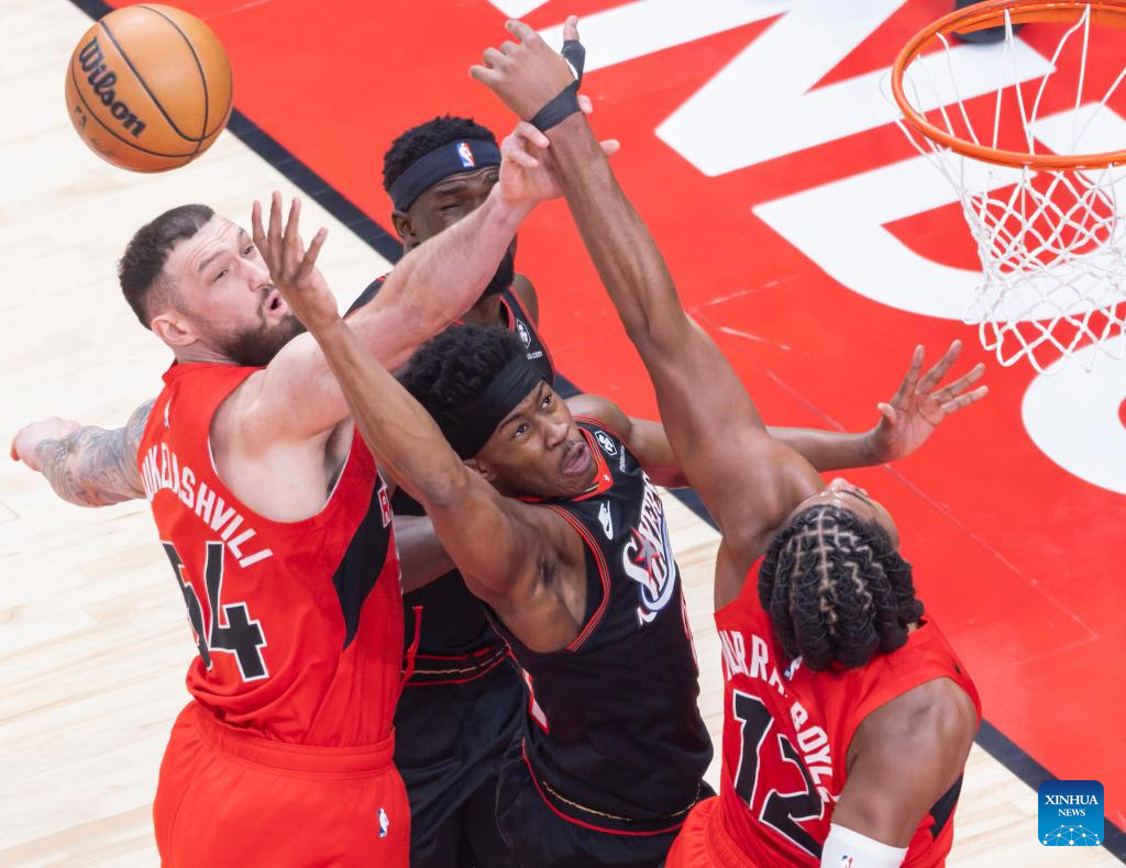 Collin Murray-Boyles (R) of Toronto Raptors fights for a rebound with Adem Bona of Philadelphia 76ers during the 2025-2026 NBA regular season game between Toronto Raptors and Philadelphia 76ers in Toronto, Canada, on Jan. 11, 2026. (Photo by Zou Zheng/Xinhua)