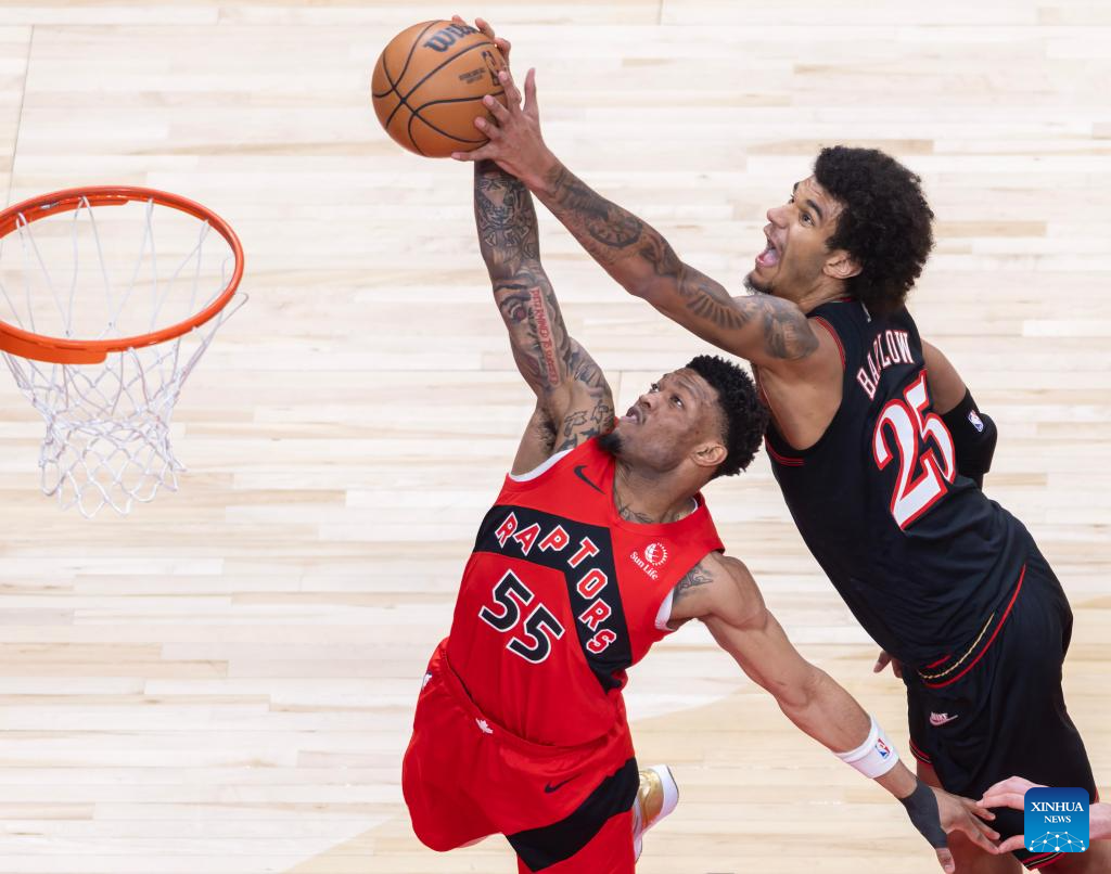 Alijah Martin (L) of Toronto Raptors fights for a rebound with Dominick Barlow of Philadelphia 76ers during the 2025-2026 NBA regular season game between Toronto Raptors and Philadelphia 76ers in Toronto, Canada, on Jan. 11, 2026. (Photo by Zou Zheng/Xinhua)