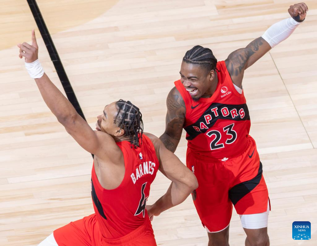 Scottie Barnes (L) and Jamal Shead of Toronto Raptors celebrate victory after the 2025-2026 NBA regular season game between Toronto Raptors and Philadelphia 76ers in Toronto, Canada, on Jan. 11, 2026. (Photo by Zou Zheng/Xinhua)