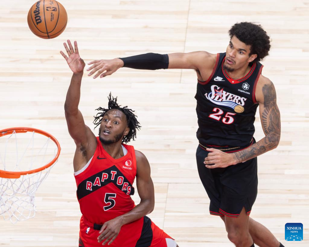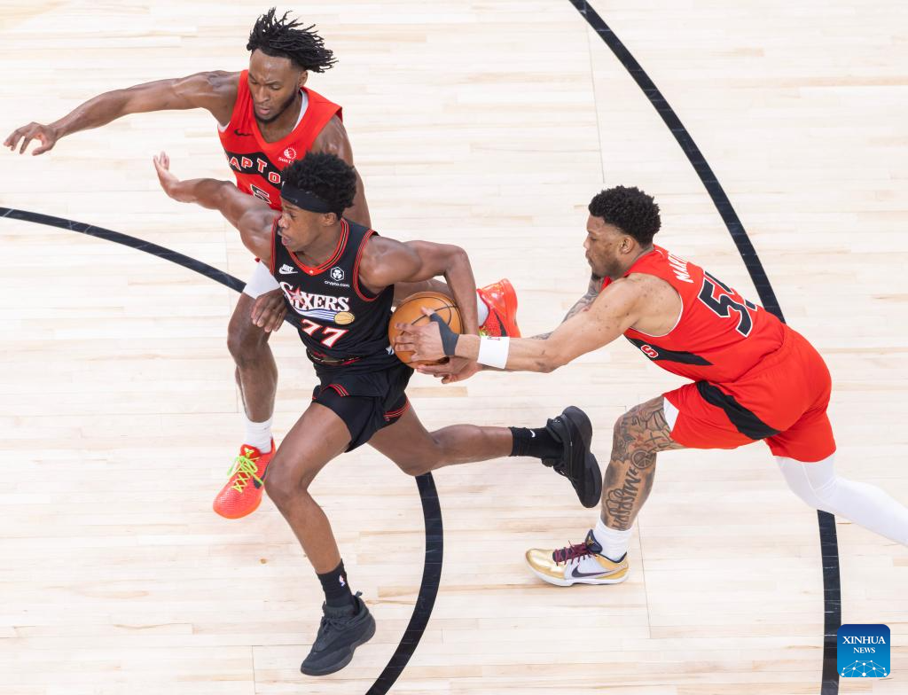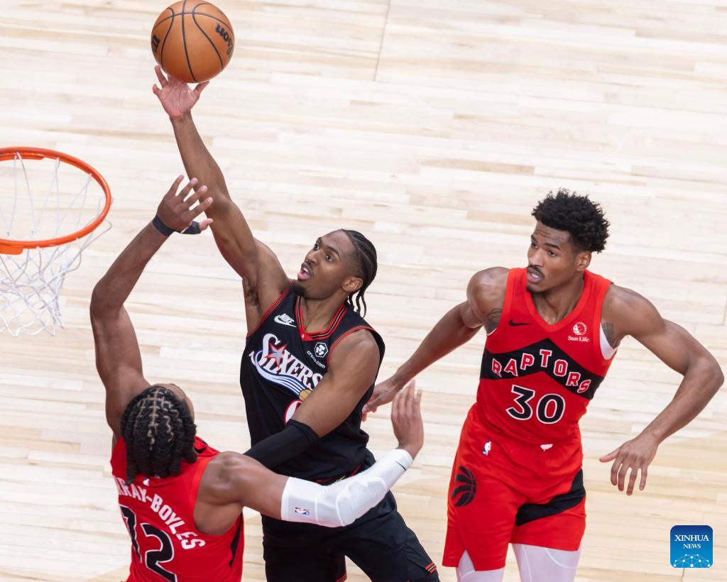 V. J. Edgecombe (2nd R) of Philadelphia 76ers goes for a layup during the 2025-2026 NBA regular season game between Toronto Raptors and Philadelphia 76ers in Toronto, Canada, on Jan. 11, 2026. (Photo by Zou Zheng/Xinhua)
