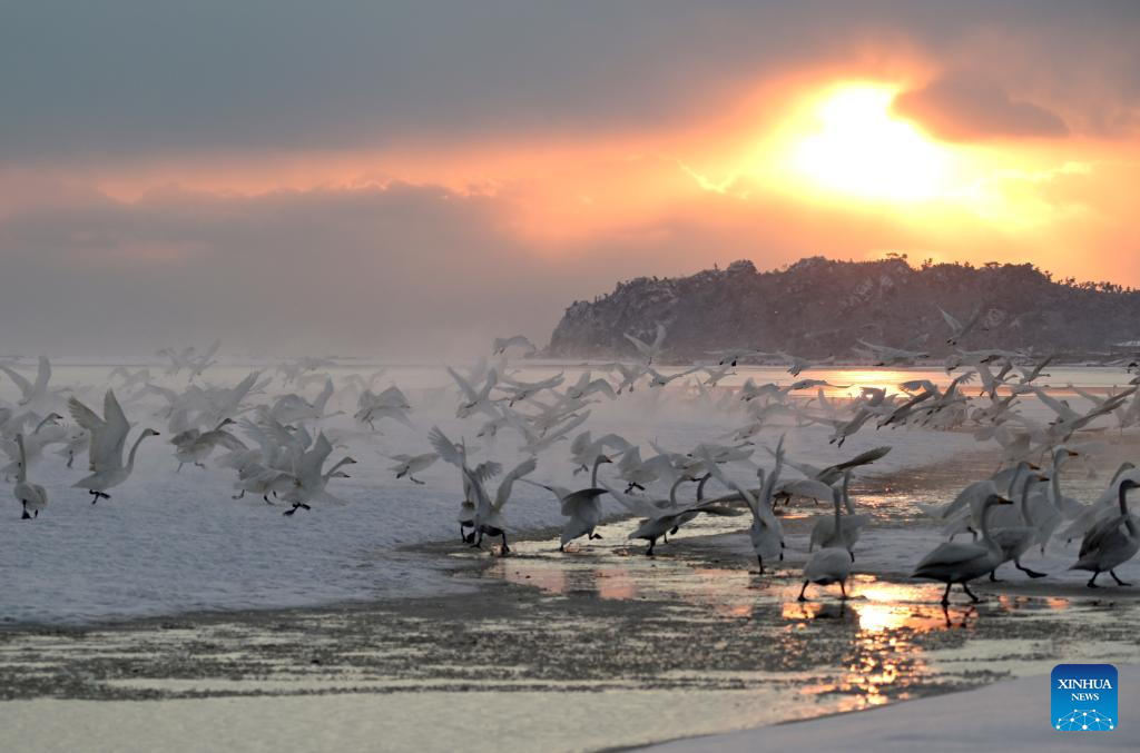 Whooper swans fly in snow at a whooper swan national nature reserve in Rongcheng City, east China's Shandong Province, Jan. 11, 2026. (Photo by Yang Zhili/Xinhua)