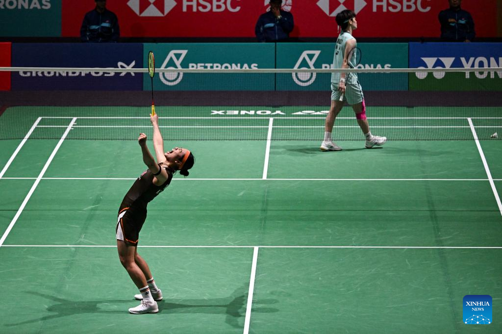 An Se Young (lower) of South Korea reacts during the women's singles final match against Wang Zhiyi of China at the Malaysia Open 2026 badminton tournament in Kuala Lumpur, Malaysia, Jan. 11, 2026. (Xinhua/Cheng Yiheng)