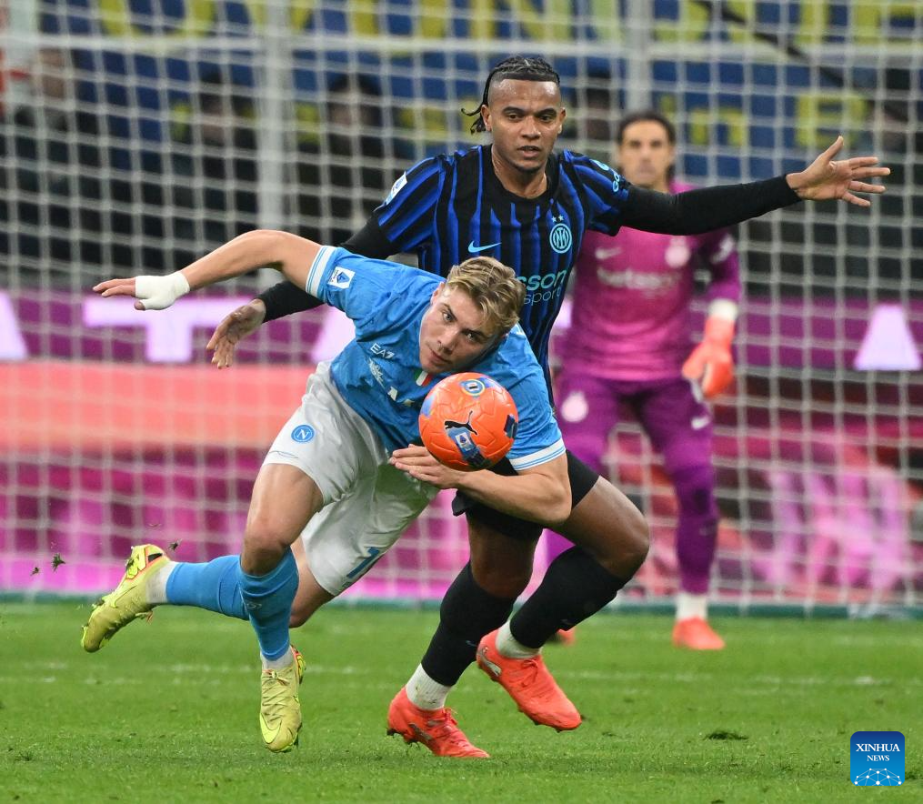 Inter Milan's Lautaro Martinez (R) vies with Napoli's Amir Rrahmani during a Serie A football match between Inter Milan and Napoli in Milan, Italy, Jan. 11, 2026. (Photo by Alberto Lingria/Xinhua)