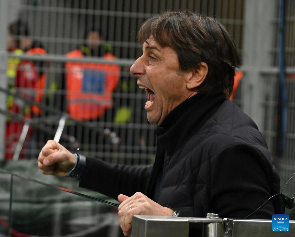 Napoli's head coach Antonio Conte reacts after taking red card during a Serie A football match between Inter Milan and Napoli in Milan, Italy, Jan. 11, 2026. (Photo by Alberto Lingria/Xinhua)