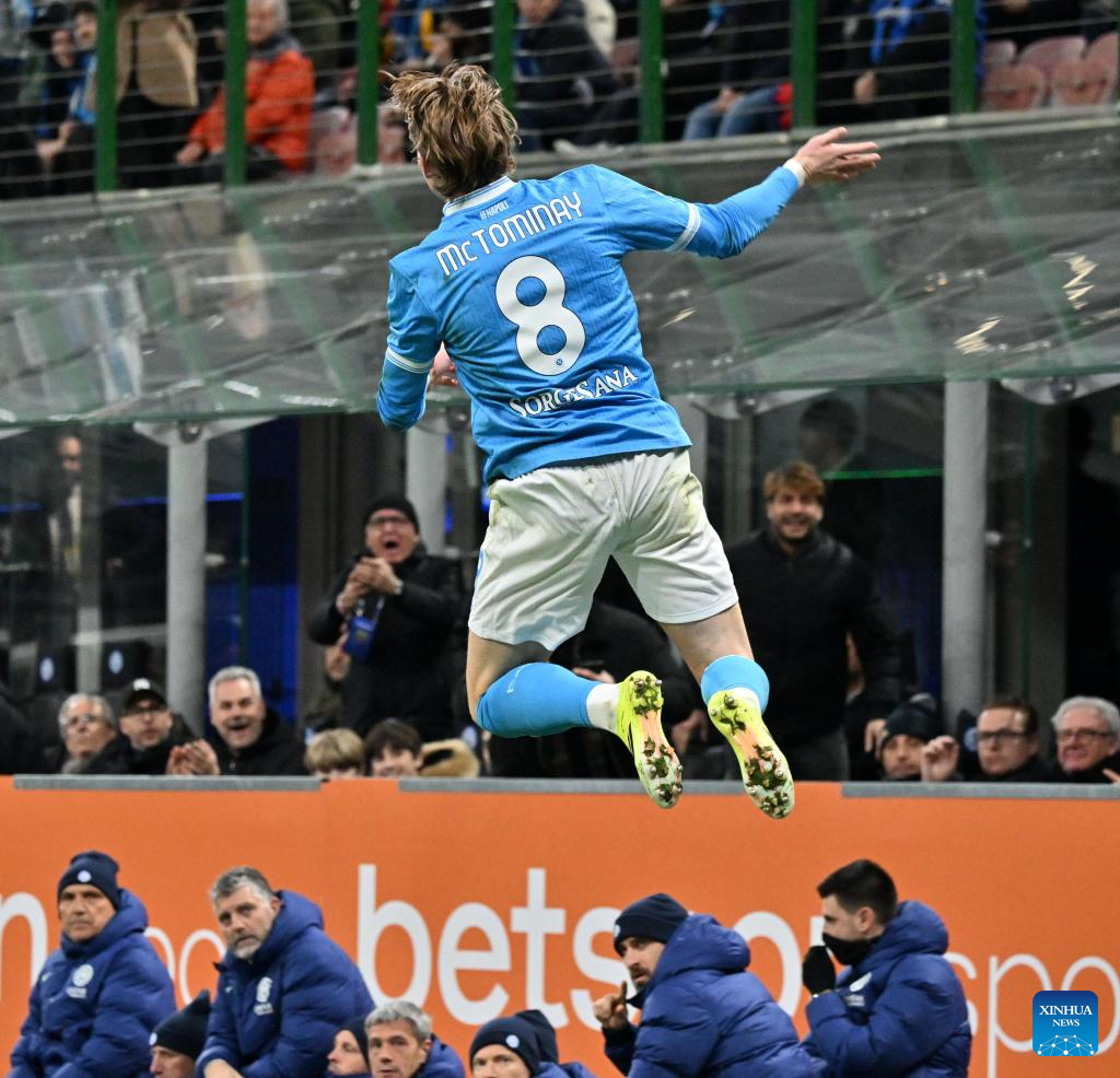 Napoli's Scott McTominay (top) celebrates his goal during a Serie A football match between Inter Milan and Napoli in Milan, Italy, Jan. 11, 2026. (Photo by Alberto Lingria/Xinhua)