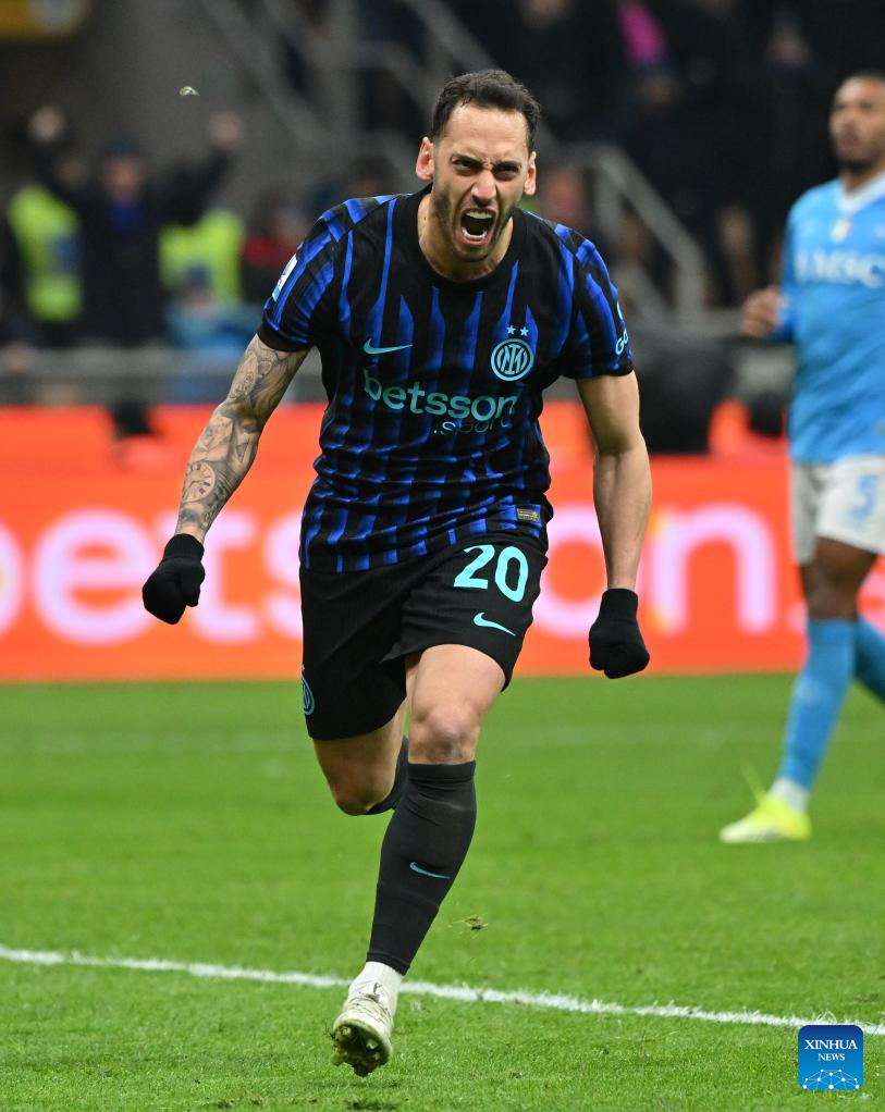 Inter Milan's Hakan Calhanoglu (C) celebrates his goal during a Serie A football match between Inter Milan and Napoli in Milan, Italy, Jan. 11, 2026. (Photo by Alberto Lingria/Xinhua)