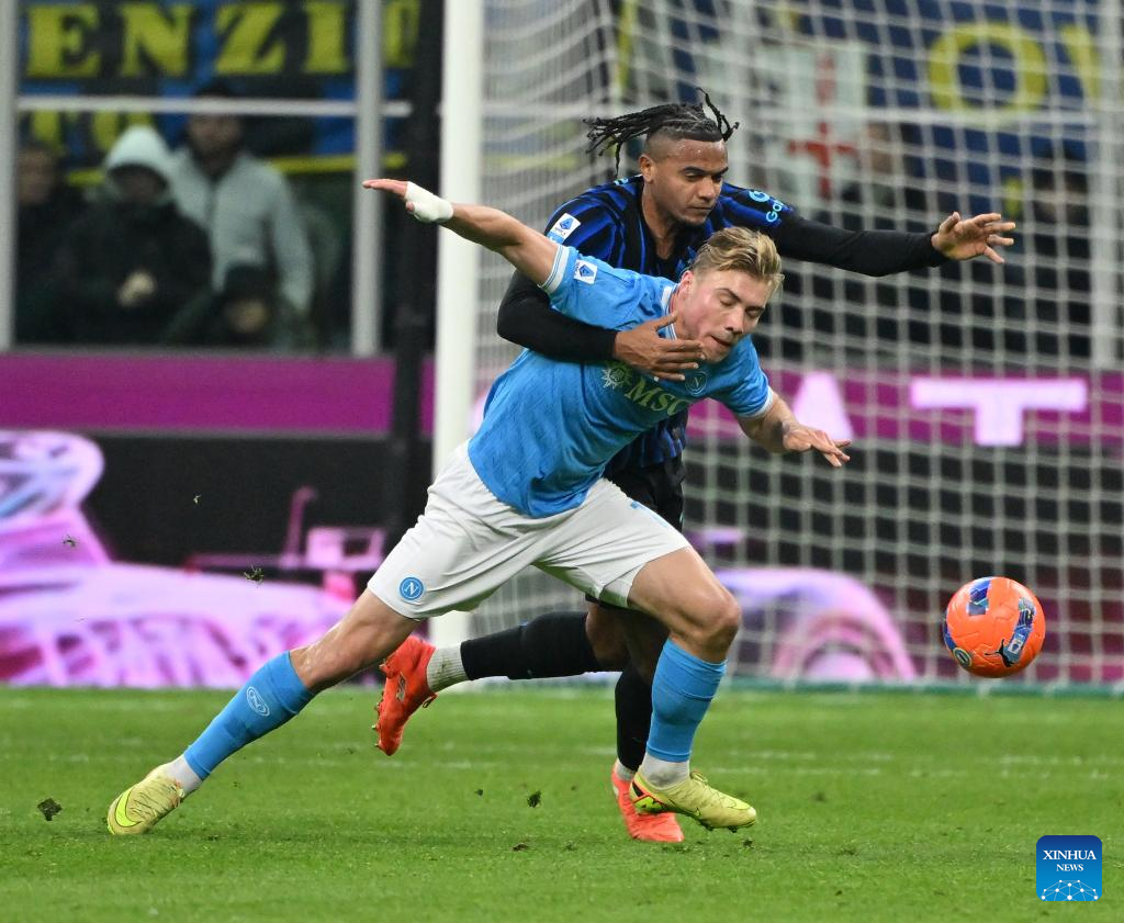Inter Milan's Piotr Zielinski (R) vies with Napoli's Giovanni Di Lorenzo during a Serie A football match between Inter Milan and Napoli in Milan, Italy, Jan. 11, 2026. (Photo by Alberto Lingria/Xinhua)