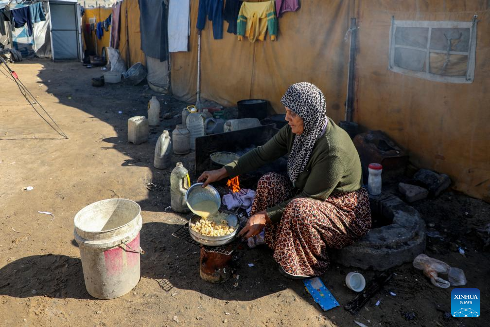 A displaced Palestinian cooks at a temporary shelter near a landfill in Gaza City, on Jan. 11, 2026. (Photo by Rizek Abdeljawad/Xinhua)