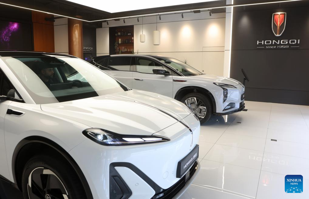 A man checks out a new electric car model of luxury brand Hongqi of Chinese automaker FAW Group, in Tel Aviv, Israel, Jan. 13, 2026. Chinese automaker FAW Group on Monday launched a new electric car model of its luxury brand Hongqi in Israel, Hongqi's official importer and dealership Samelet said. (Photo by Gil Cohen Magen/Xinhua)