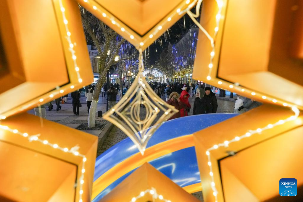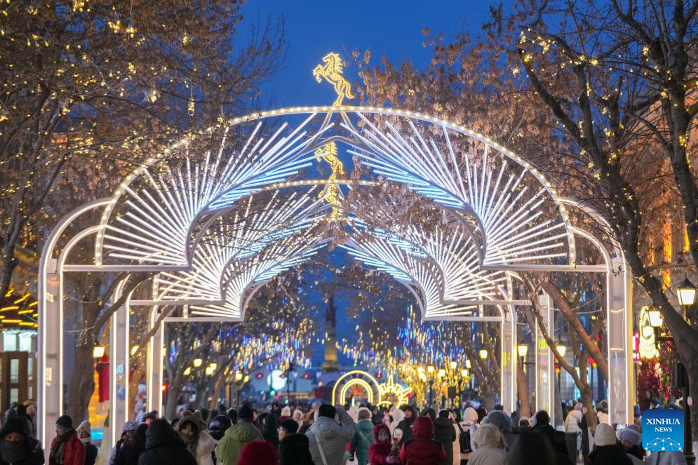 People visit the Central Street in Harbin, northeast China's Heilongjiang Province, Jan. 8, 2026. As one of the most popular attractions in Harbin, the Central Street, which is renowned for its diverse European-style architecture, wows tourists with its colorful lights at night during the city's tourism boom this winter. (Xinhua/Wang Jianwei)