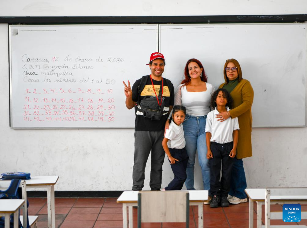 Several teachers and students pose for a group photo in a classroom on the first day of the new semester in a public school in Caracas, Venezuela, Jan. 12, 2026. The second half of the 2025-2026 academic year for primary and secondary education began on Monday in Venezuela. (Xinhua/Ding Hongfa)