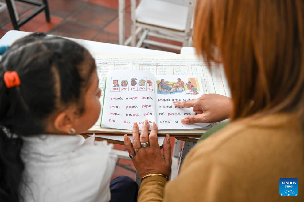 A student learns to read on the first day of the new semester in a public school in Caracas, Venezuela, Jan. 12, 2026. The second half of the 2025-2026 academic year for primary and secondary education began on Monday in Venezuela. (Xinhua/Ding Hongfa)