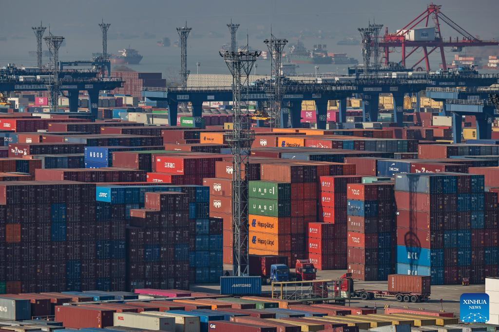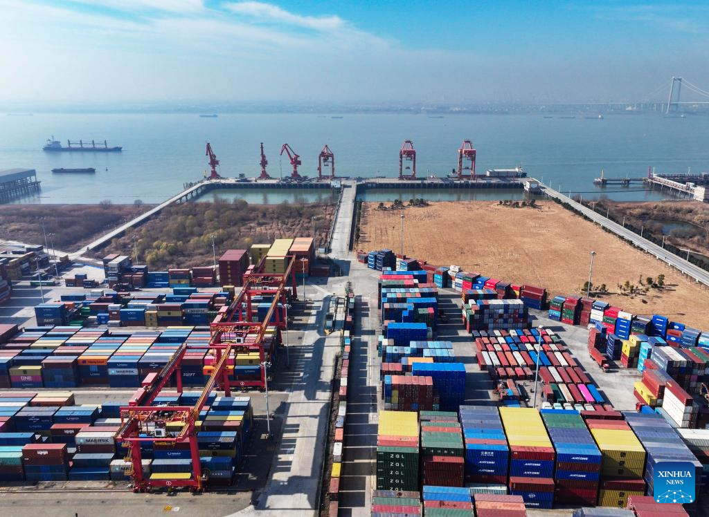 An aerial drone photo taken on Jan. 14, 2026 shows cargo ships loading and unloading containers at a container terminal of Taizhou Port in Taizhou, east China's Jiangsu Province. (Photo by Zhou Shegen/Xinhua)