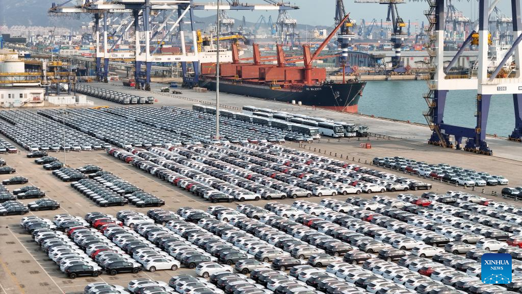 An aerial drone photo taken on Jan. 14, 2026 shows domestic vehicles to be loaded for export at Yantai Port in east China's Shandong Province. (Photo by Tang Ke/Xinhua)