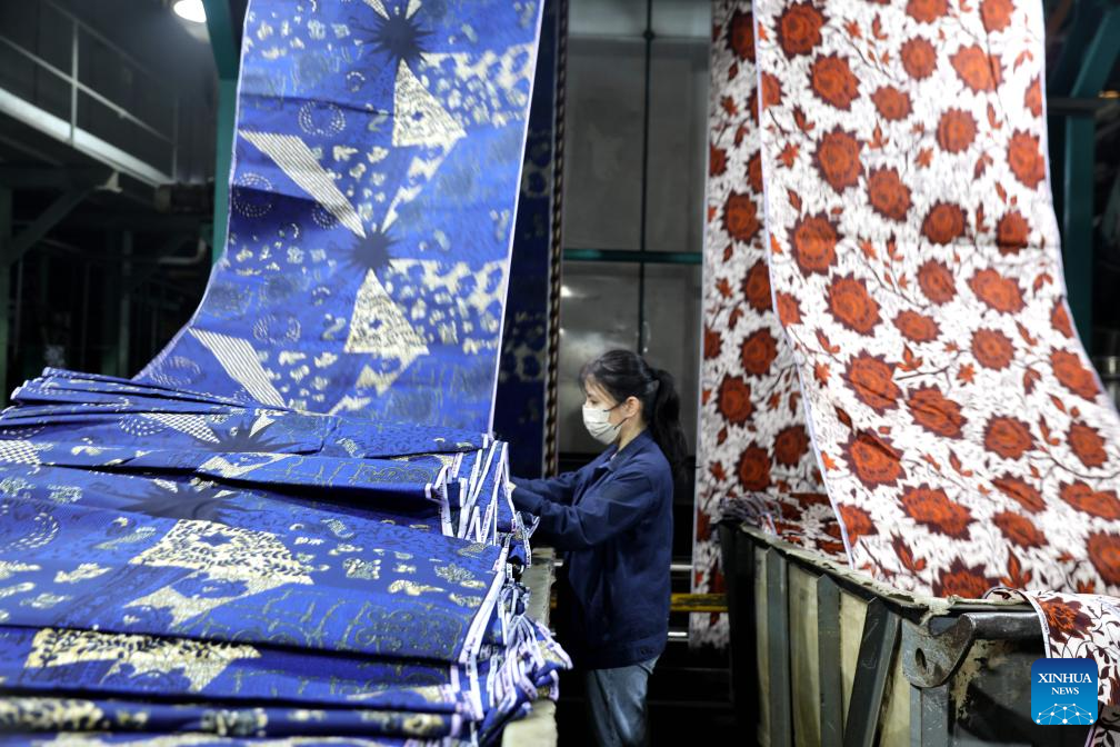 A worker processes fabric for export to Africa at a workshop in Binzhou, east China's Shandong Province, Jan. 14, 2026. (Photo by Chu Baorui/Xinhua)