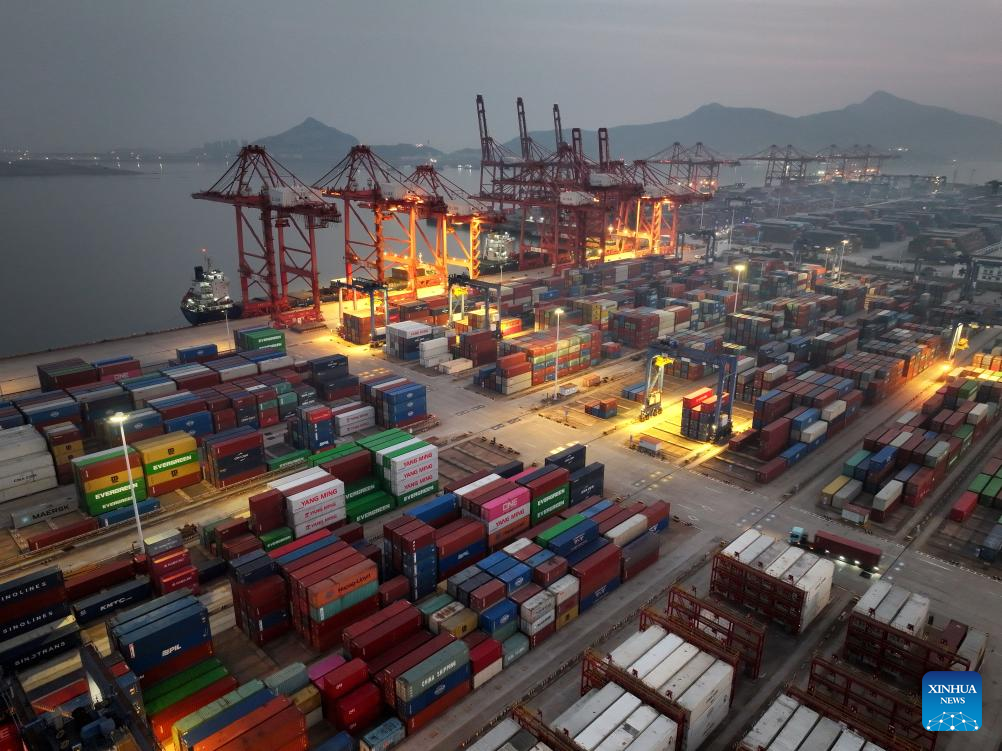 An aerial drone photo taken on Jan. 14, 2026 shows cargo ships loading and unloading containers at a container terminal in Xiamen, southeast China's Fujian Province. (Photo by Zeng Demeng/Xinhua)