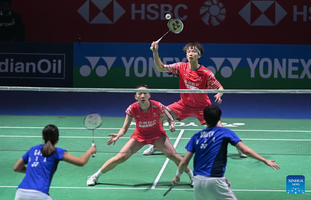 Jiang Zhenbang (2nd R)/Wei Yaxin (2nd L) of China compete during the mixed doubles 1/16 final match against Presley Smith/Jennie Gai of the United States at the India Open 2026 in New Delhi, India, Jan. 14, 2026. (Xinhua/Javed Dar)