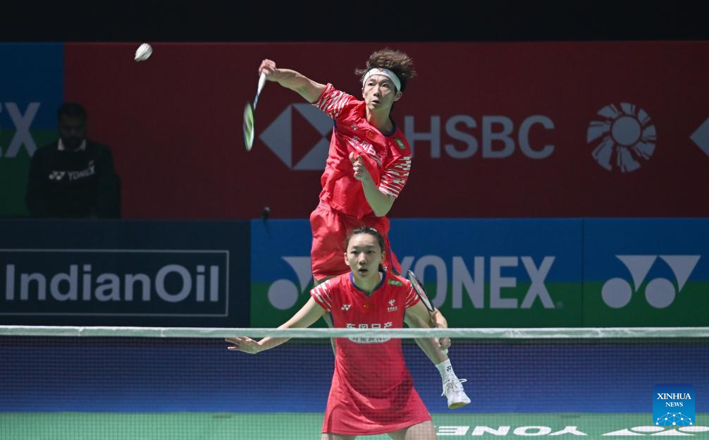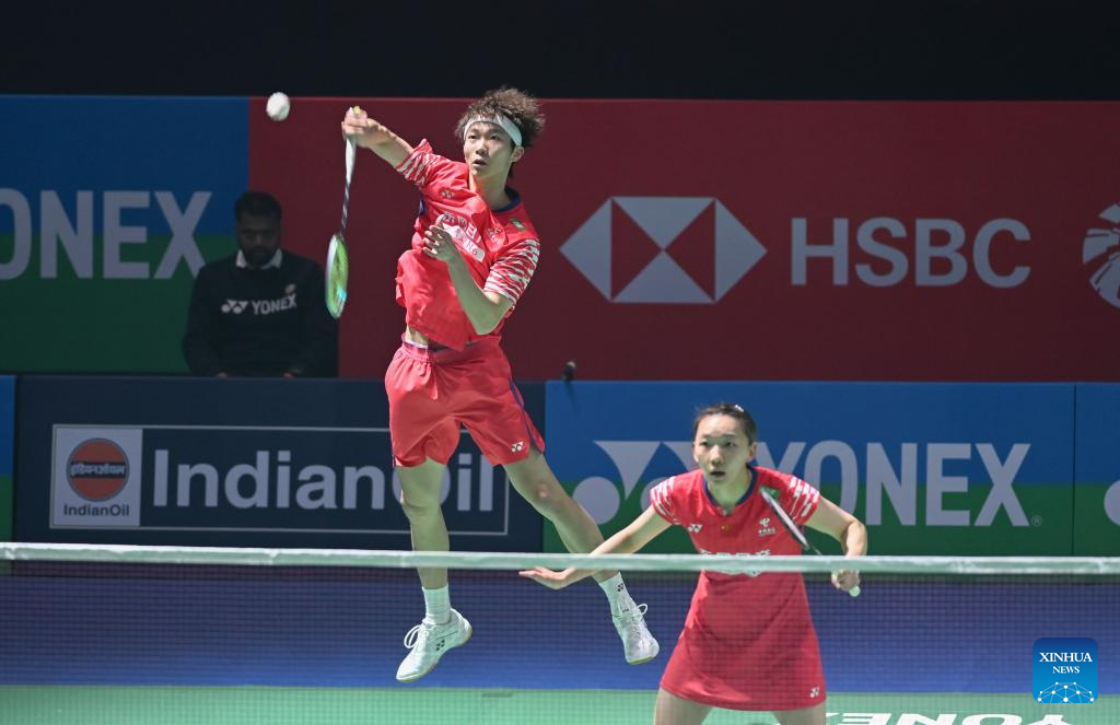 Jiang Zhenbang (R)/Wei Yaxin of China compete during the mixed doubles 1/16 final match against Presley Smith/Jennie Gai of the United States at the India Open 2026 in New Delhi, India, Jan. 14, 2026. (Xinhua/Javed Dar)