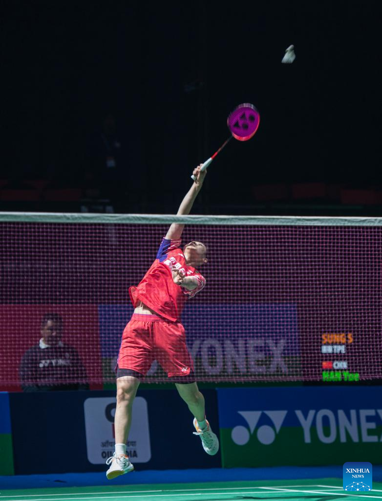 Han Yue of China competes during the women's singles 1/16 final match against Sung Shuo Yun of Chinese Taipei at the India Open 2026 in New Delhi, India, Jan. 14, 2026. (Xinhua/Javed Dar)