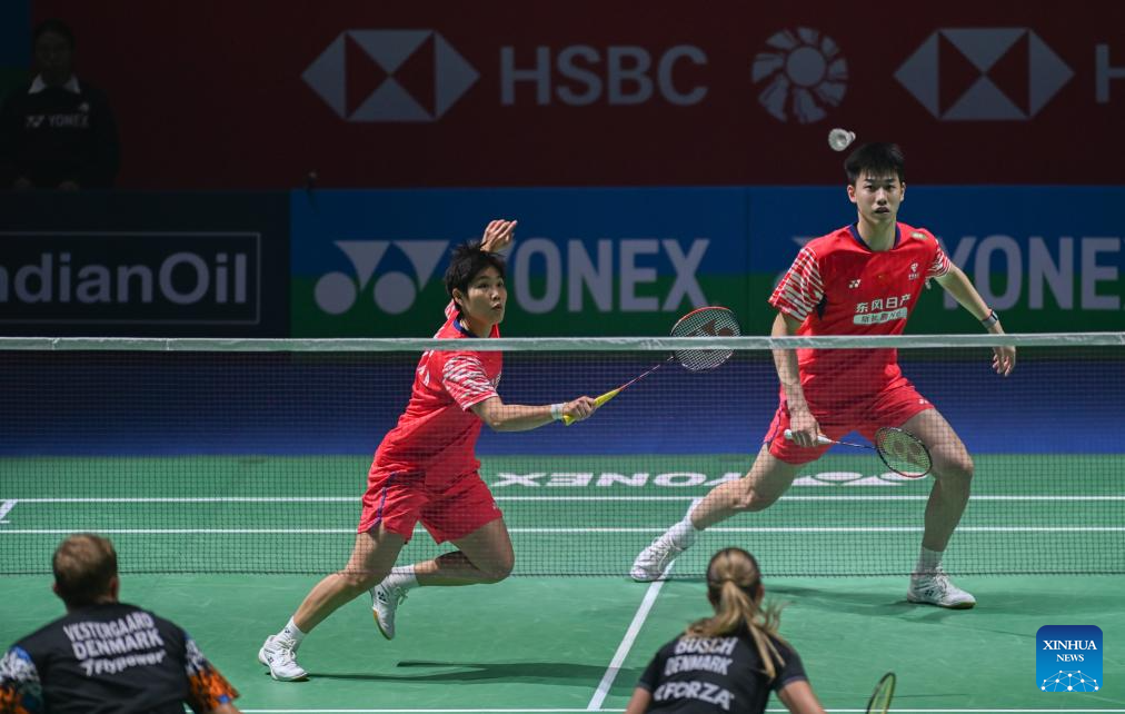 Hong Dongping (L)/Feng Yanzhe of China compete during the mixed doubles 1/16 final match against Mads Vestergaard/Christine Busch of Denmark at the India Open 2026 in New Delhi, India, Jan. 14, 2026. (Xinhua/Javed Dar)