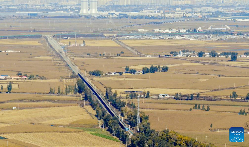 The 35,000-tonne heavy-haul group train moves during the inaugural trial along the Baotou-Shenmu Railway in north China's Inner Mongolia Autonomous Region, Dec. 8, 2025. (Photo by Song Gaojie/Xinhua)
