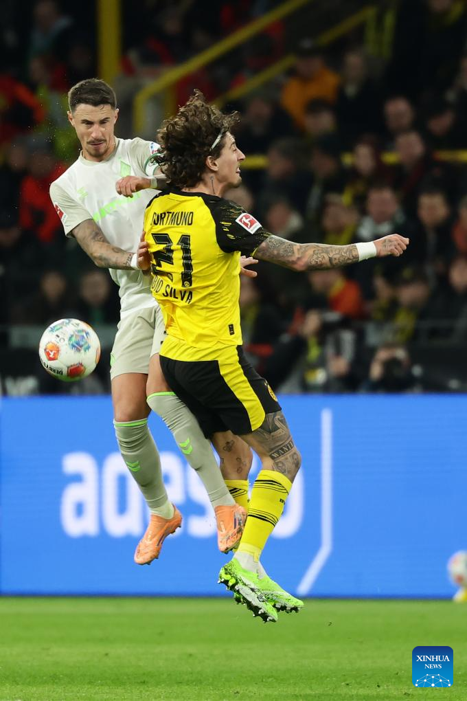 Fabio Silva (L) of Borussia Dortmund vies with Amos Pieper of SV Werder Bremen during the German first division Bundesliga football match between Borussia Dortmund and SV Werder Bremen in Dortmund, Germany, Jan. 13, 2026. (Photo by Joachim Bywaletz/Xinhua)