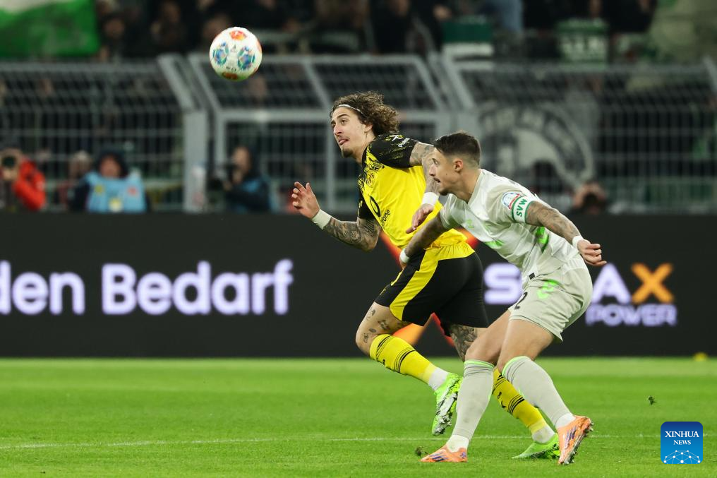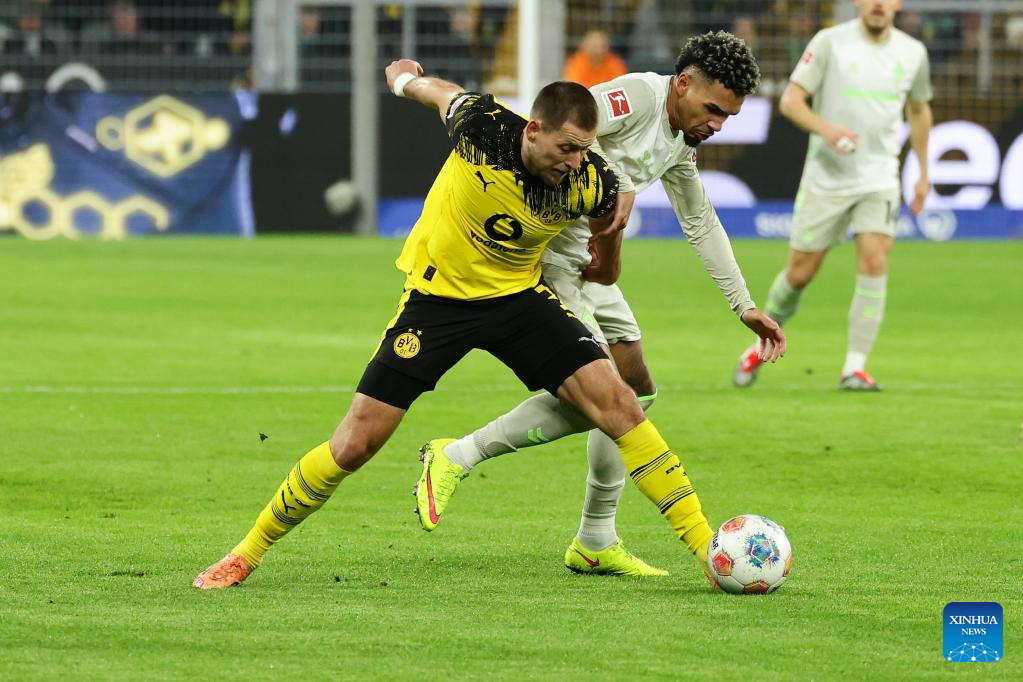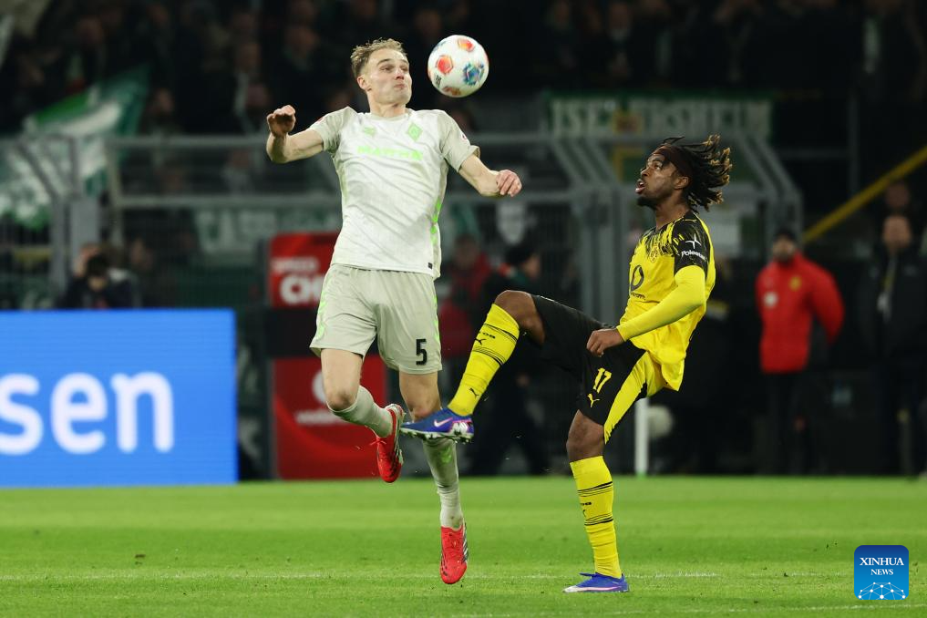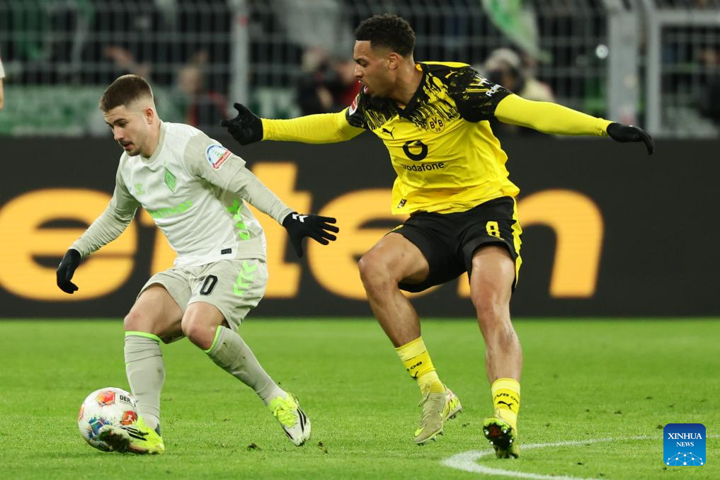 Felix Nmecha (R) of Borussia Dortmund vies with Romano Schmid of SV Werder Bremen during the German first division Bundesliga football match between Borussia Dortmund and SV Werder Bremen in Dortmund, Germany, Jan. 13, 2026. (Photo by Joachim Bywaletz/Xinhua)