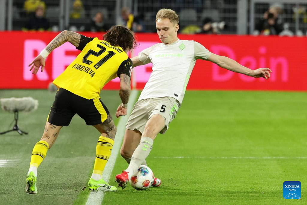 Fabio Silva (L) of Borussia Dortmund vies with Marco Friedl of SV Werder Bremen during the German first division Bundesliga football match between Borussia Dortmund and SV Werder Bremen in Dortmund, Germany, Jan. 13, 2026. (Photo by Joachim Bywaletz/Xinhua)
