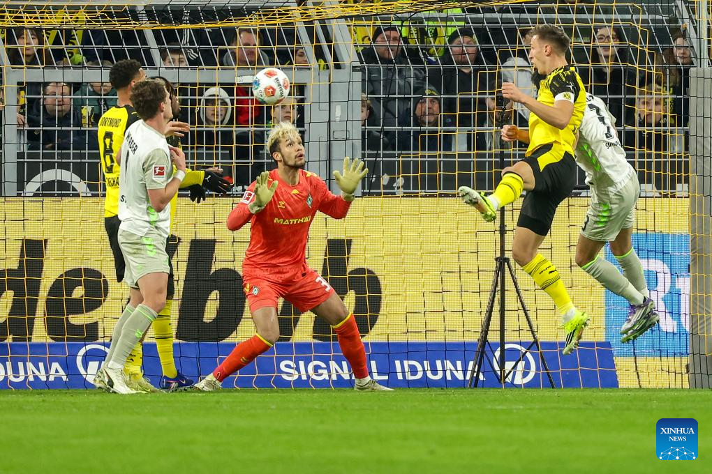 Nico Schlotterbeck (2nd R) of Borussia Dortmund heads for the ball to score during the German first division Bundesliga football match between Borussia Dortmund and SV Werder Bremen in Dortmund, Germany, Jan. 13, 2026. (Photo by Joachim Bywaletz/Xinhua)
