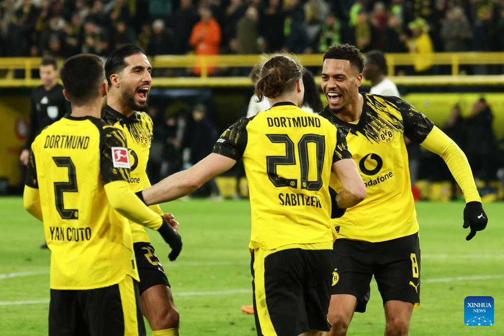Players of Borussia Dortmund celebrate scoring during the German first division Bundesliga football match between Borussia Dortmund and SV Werder Bremen in Dortmund, Germany, Jan. 13, 2026. (Photo by Joachim Bywaletz/Xinhua)