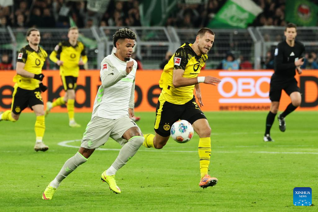 Waldemar Anton (R, front) of Borussia Dortmund vies with Justin Njinmah of SV Werder Bremen during the German first division Bundesliga football match between Borussia Dortmund and SV Werder Bremen in Dortmund, Germany, Jan. 13, 2026. (Photo by Joachim Bywaletz/Xinhua)
