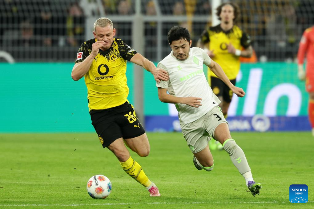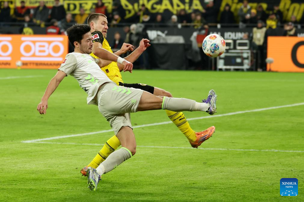 Julian Ryerson (L) of Borussia Dortmund vies with Sugawara Yukinari of SV Werder Bremen during the German first division Bundesliga football match between Borussia Dortmund and SV Werder Bremen in Dortmund, Germany, Jan. 13, 2026. (Photo by Joachim Bywaletz/Xinhua)