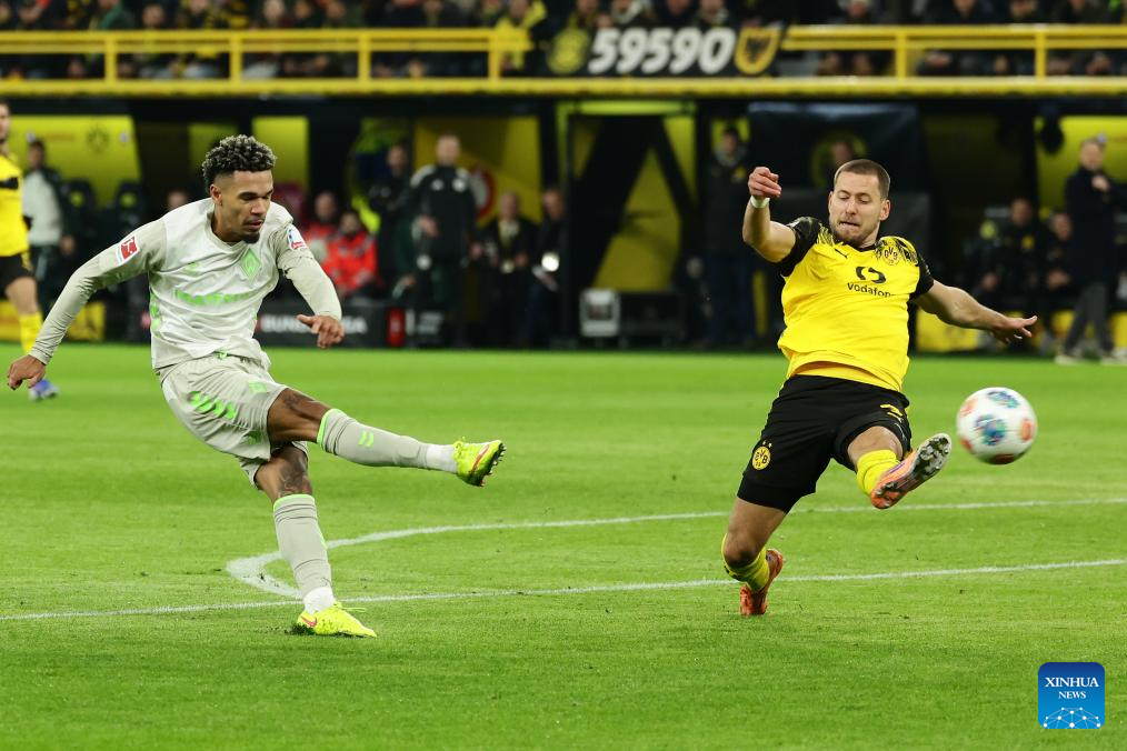 Carney Chukwuemeka (R) of Borussia Dortmund vies with Amos Pieper of SV Werder Bremen during the German first division Bundesliga football match between Borussia Dortmund and SV Werder Bremen in Dortmund, Germany, Jan. 13, 2026. (Photo by Joachim Bywaletz/Xinhua)