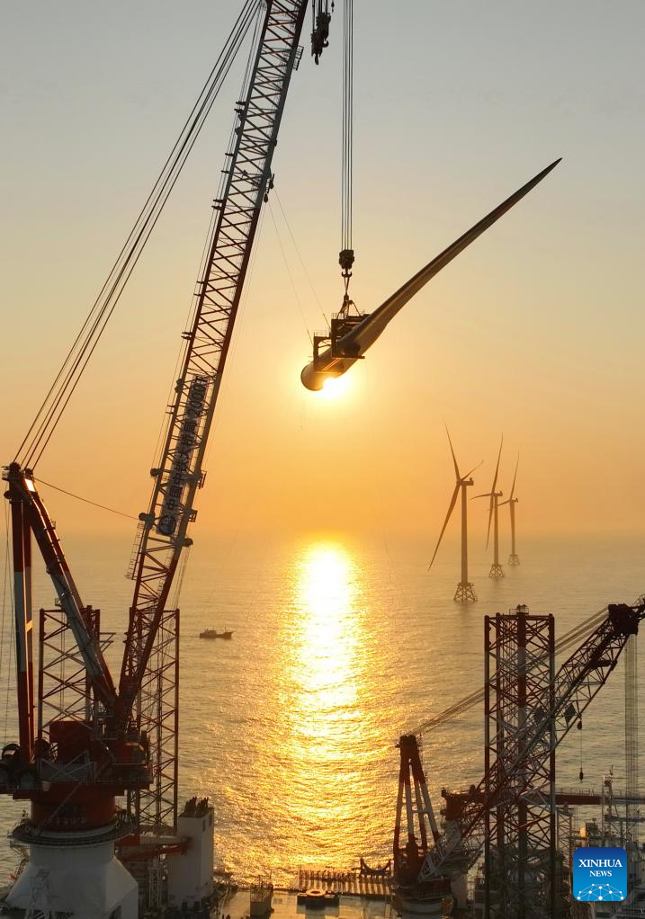 This drone photo taken on Jan. 13, 2026 shows one of the turbine blades being hoisted at the construction site of a 20-megawatt offshore wind turbine unit in the coastal waters of southeast China's Fujian Province. The wind turbine unit was successfully hoisted and installed here on Tuesday. (Xinhua/Lin Shanchuan)