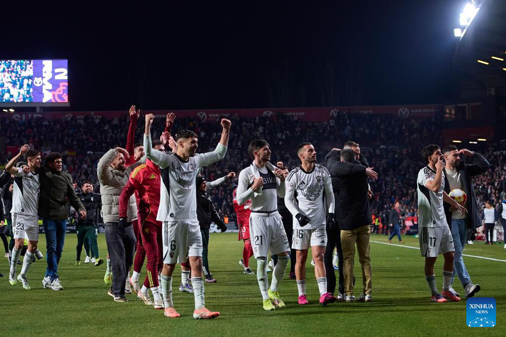 Players of Albacete celebrates the victory after the Copa del Rey round of 16 football match between Albacete and Real Madrid in Albacete, Spain, Jan. 14, 2026. (Stringer/Xinhua)