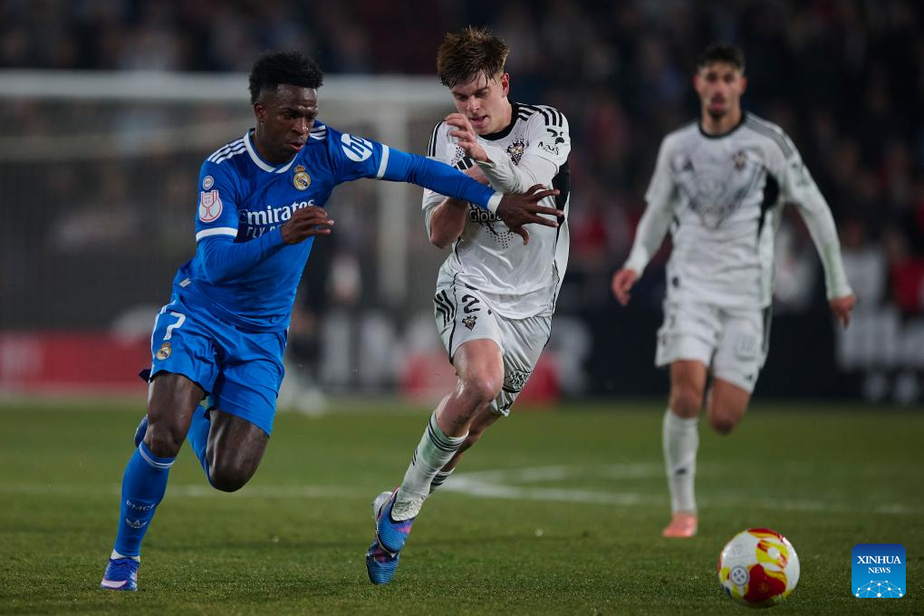 Dani Bernabeu (C) of Albacete disputes the ball with Vinicius JR (L) of Real Madrid during the Copa del Rey round of 16 football match between Albacete and Real Madrid in Albacete, Spain, Jan. 14, 2026. (Stringer/Xinhua)