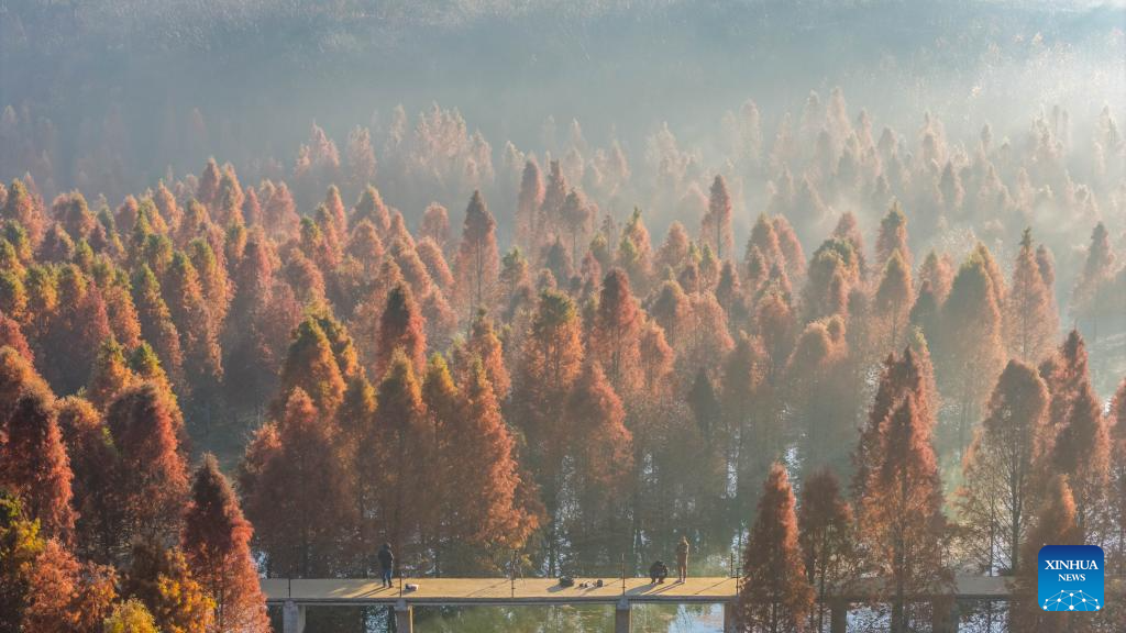 An aerial drone photo taken on Jan. 14, 2026 shows a redwood wetland at dawn in Panlong District, Kunming, southwest China's Yunnan Province. (Xinhua/Hu Chao)