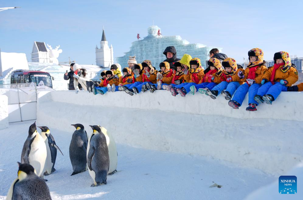 Children from southwest China's Guangxi Zhuang Autonomous Province, nicknamed as "Little Sugar Orange", watch penguins at Changchun Ice and Snow New World in Changchun, northeast China's Jilin Province, Jan. 14, 2026. A study tour composed of over a dozen children aged 3 to 6 from Guangxi traveled over 3,000 kilometers from the warm south to the northeast to experience the icy world. (Xinhua/Yan Linyun)