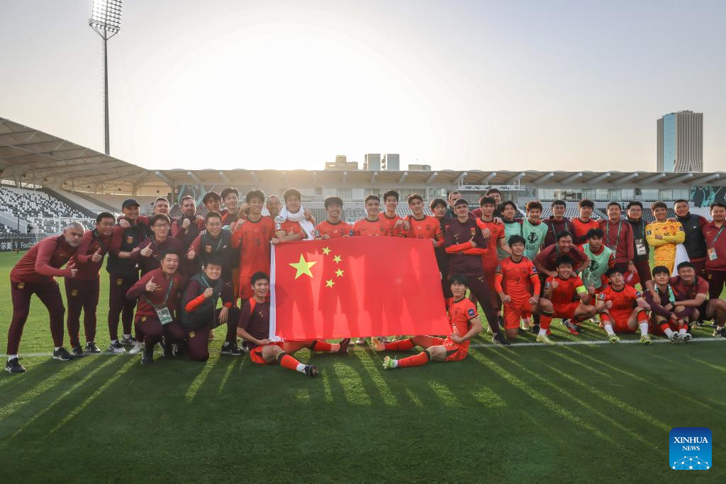 Team China pose for a photograph to celebrate qualifying to the knockout stage after the 2026 AFC U23 Asian Cup group D match between China and Thailand in Riyadh, Saudi Arabia, Jan. 14, 2026. (Xinhua/Wang Haizhou)