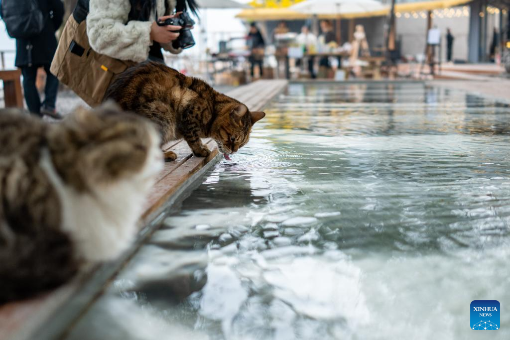 A cat laps water from a flowing water feature at a cat-themed park in Nan'an District, southwest China's Chongqing, Jan. 14, 2026. Since 2025, a vacant lot along the Yangtze River in Chongqing's Nan'an District has been transformed into a cat-themed park. Covering 30,000 square meters, the park serves as a sanctuary for abandoned or injured stray cats.