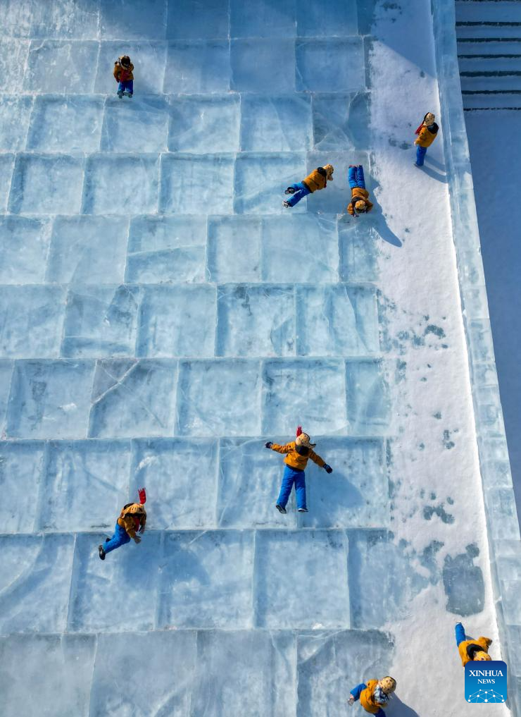 A drone photo shows children playing at an ice-and-snow themed park in Changchun, northeast China's Jilin Province, Jan. 14, 2026.