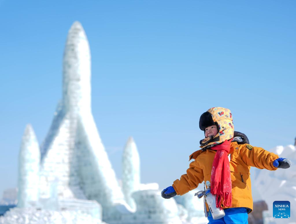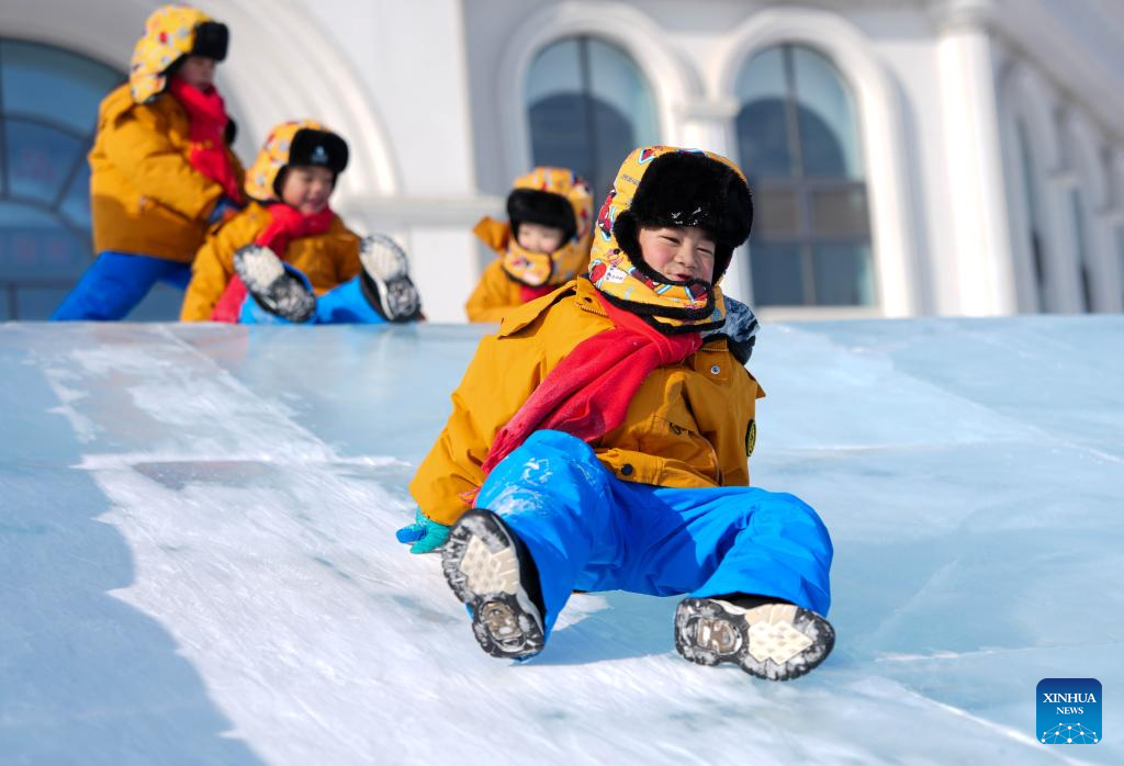 Children play at an ice-and-snow themed park in Changchun, northeast China's Jilin Province, Jan. 14, 2026.