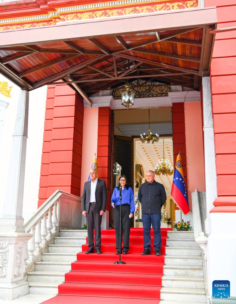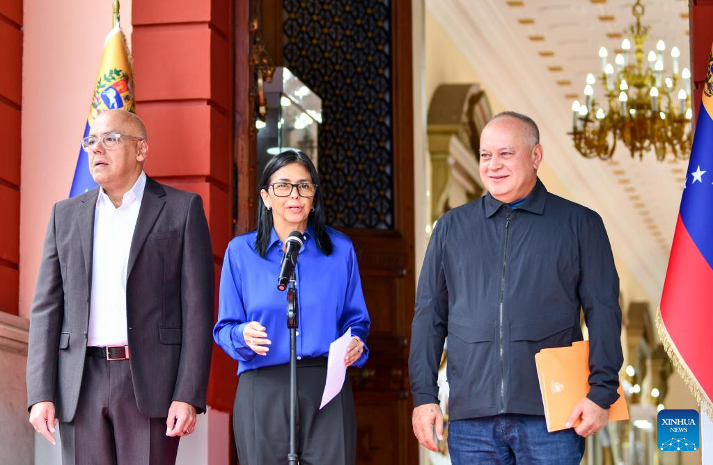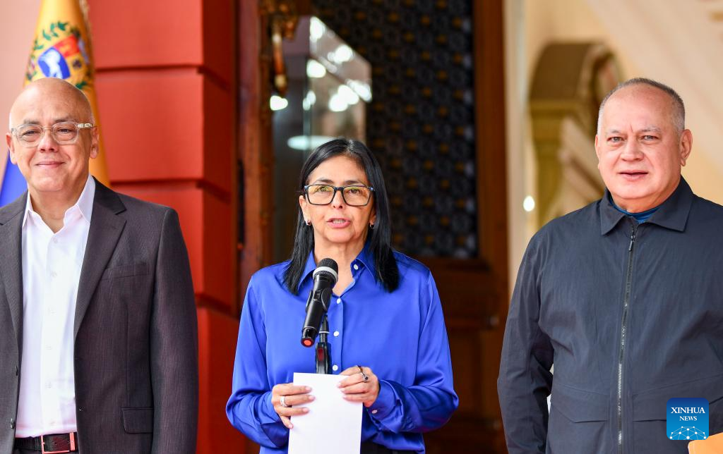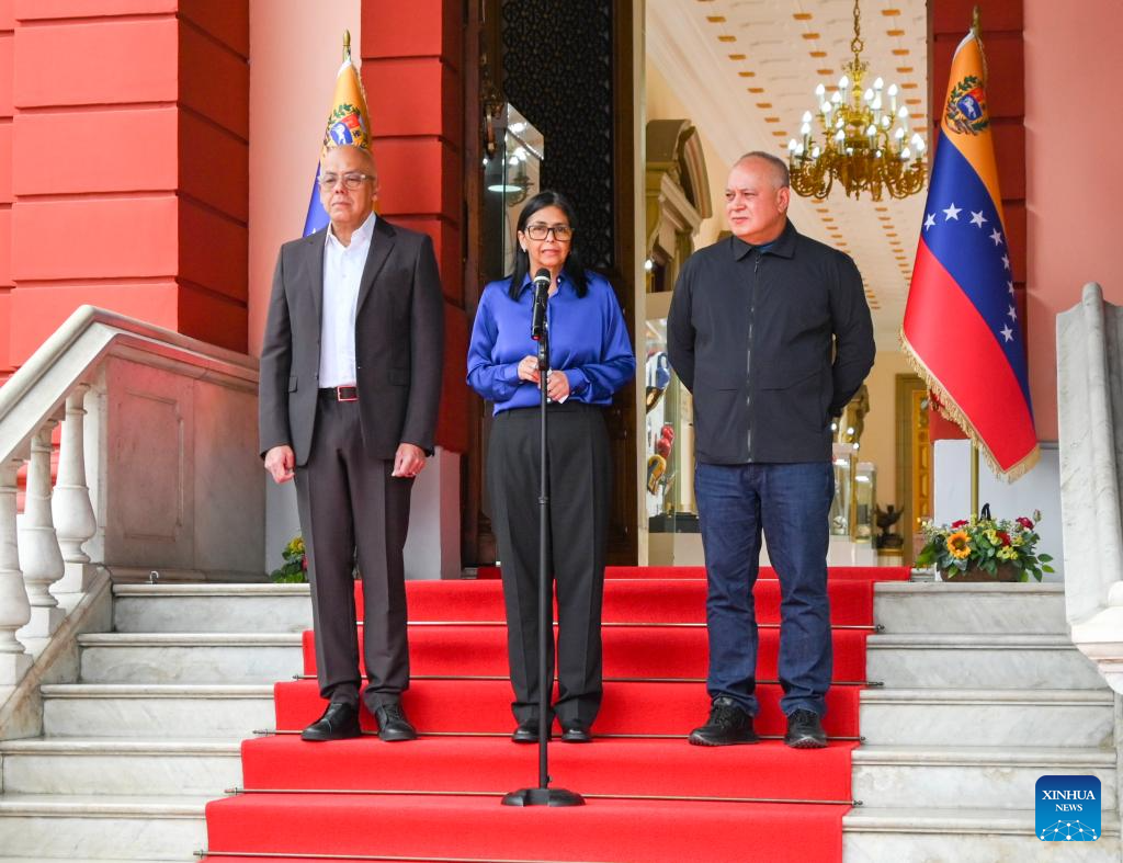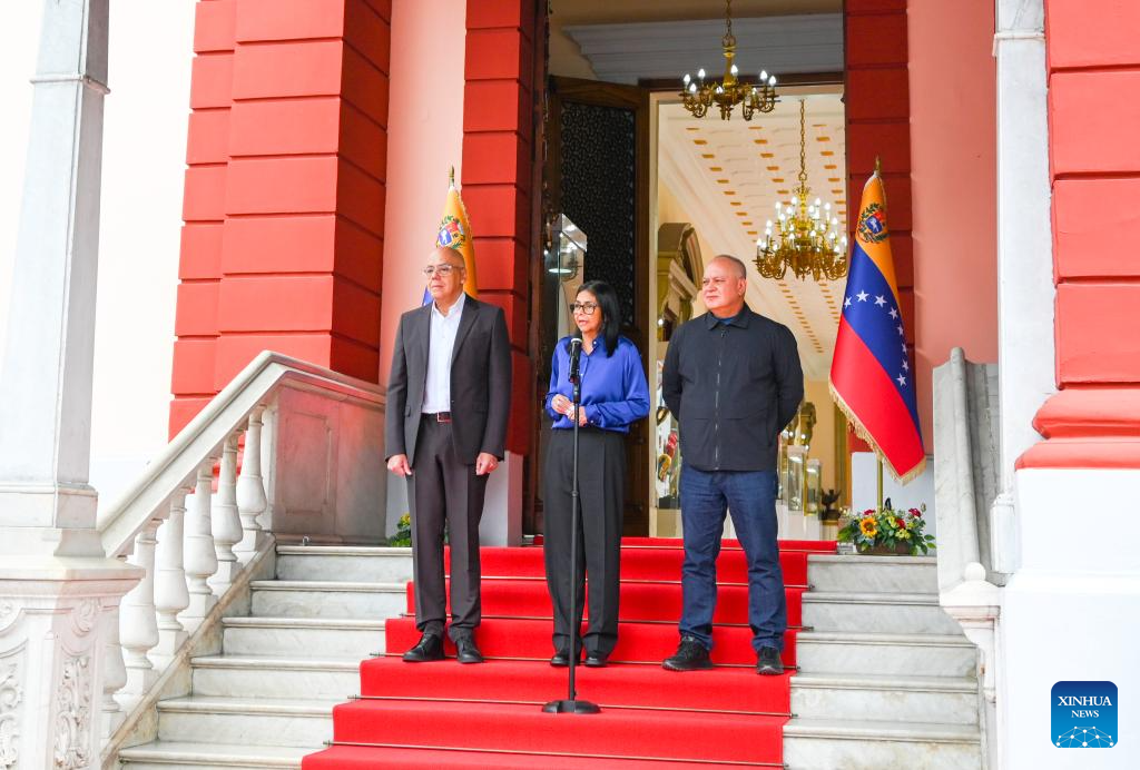 Venezuela's acting president Delcy Rodriguez (C), National Assembly President Jorge Rodriguez (1st L) and Interior Minister Diosdado Cabello attend a press conference in Caracas, Venezuela, Jan. 14, 2026. (Xinhua/Ding Hongfa)