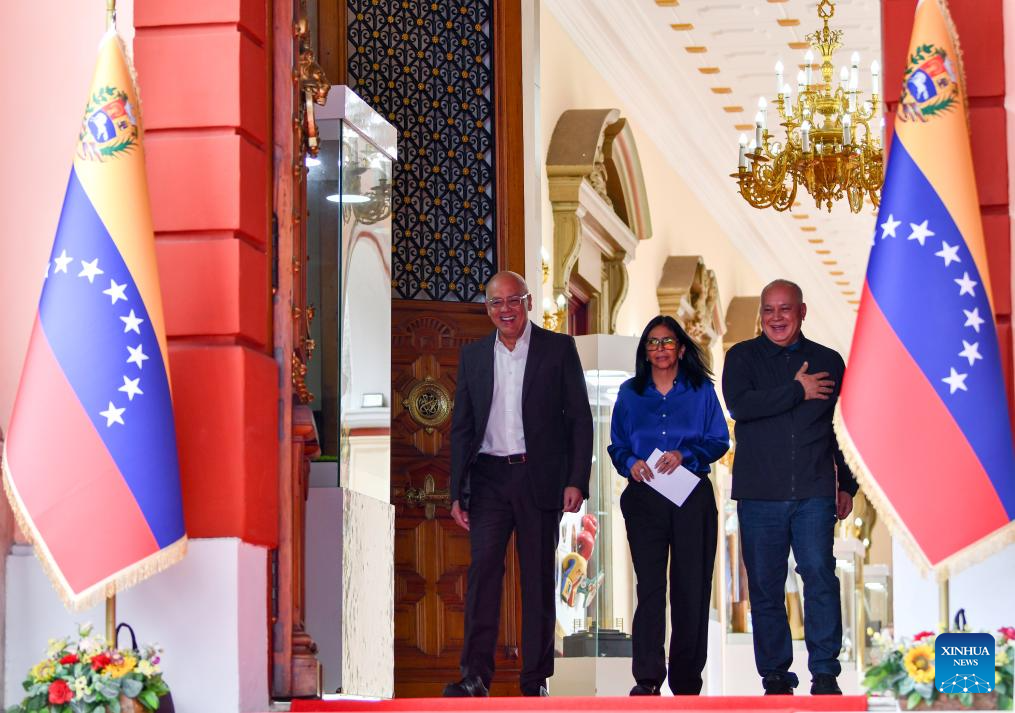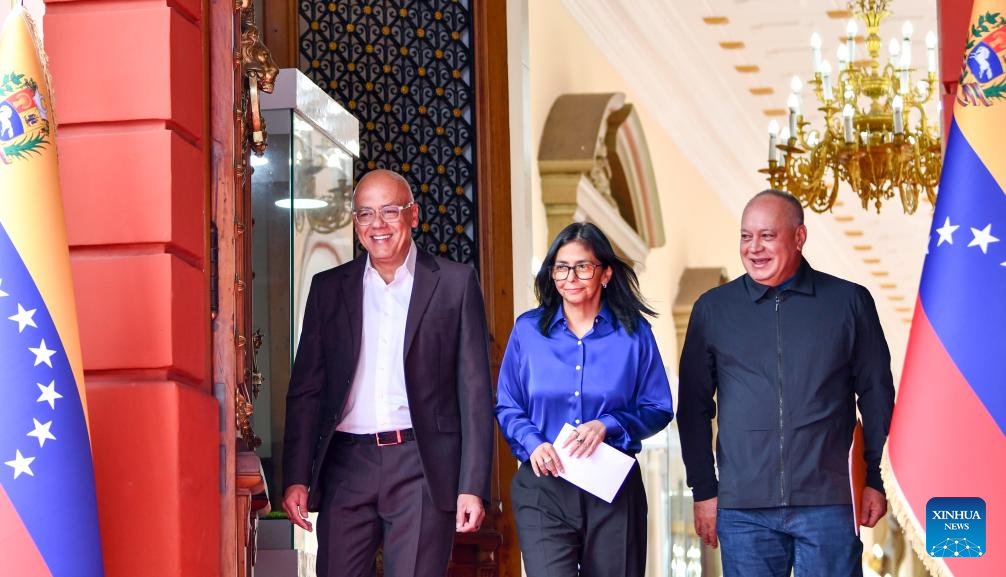 Venezuela's acting president Delcy Rodriguez (C), National Assembly President Jorge Rodriguez (1st L) and Interior Minister Diosdado Cabello arrive to attend a press conference in Caracas, Venezuela, Jan. 14, 2026. (Xinhua/Ding Hongfa)