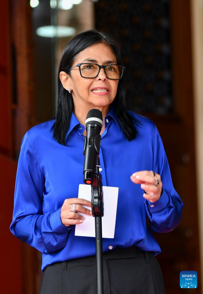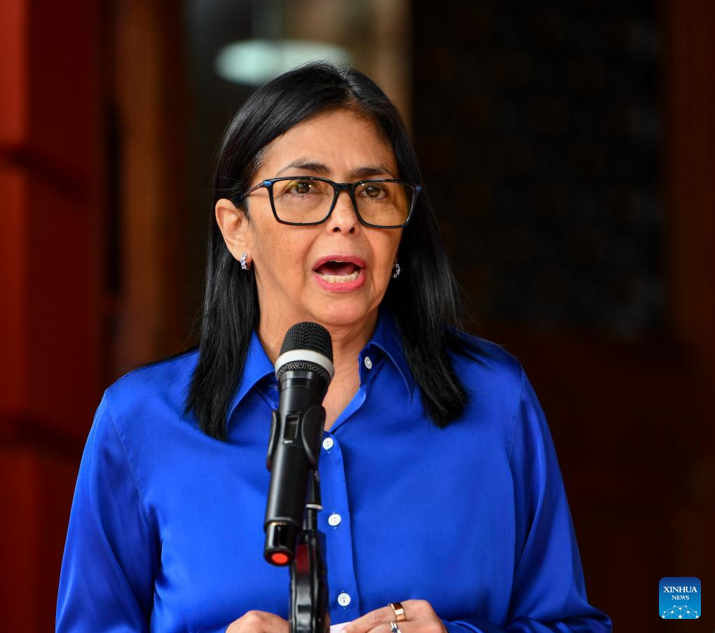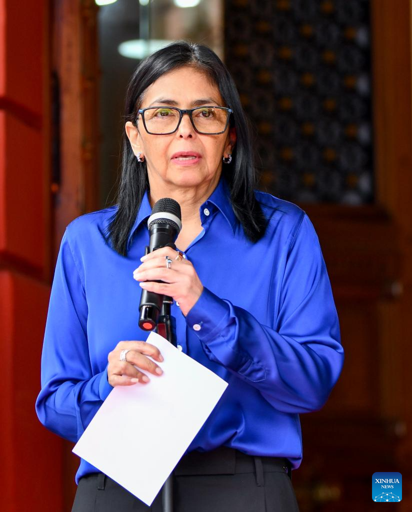 Venezuela's acting president Delcy Rodriguez attends a press conference in Caracas, Venezuela, Jan. 14, 2026. (Xinhua/Ding Hongfa)